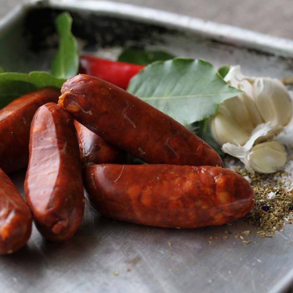The sausage has been semi-cured for four days. This results in a softer sausage that retains moisture whilst becoming crispy – perfect for cooking! The key to a good Chorizo is Spanish Paprika, we use just the right amount of premium quality paprika to give our Chorizo its signature taste. A fast cured sausage perfect to either cook on the grill or barbecue but also that works well in sauces, soups and stews providing depth of flavour through our secret spice blend. It comes in packets of 6 sausages with a three month shelf life. It is a very versatile ingredient to use in all types of cooking or cooking methods.