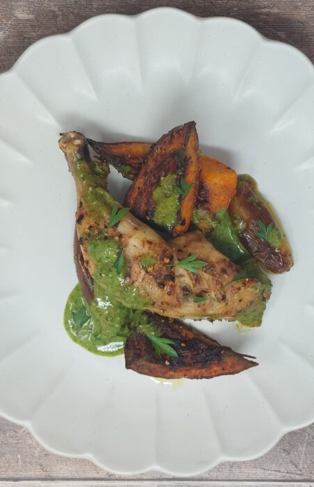 Once the squash is golden brown, the shallots caramelised and the chicken is cooked through, remove the tray from the oven to rest for 5-10 minutes.