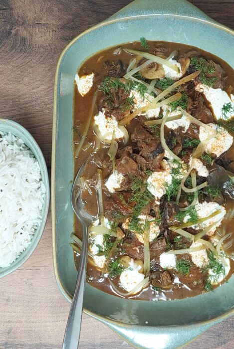 Bring the stroganoff to a gentle simmer and add the sour cream. Gently swirl it through before serving in a large bowl or serving dish. Finish the stroganoff with the picked dill and sliced gherkins. Best served with steamed wild or basmati rice and a final dusting of paprika.